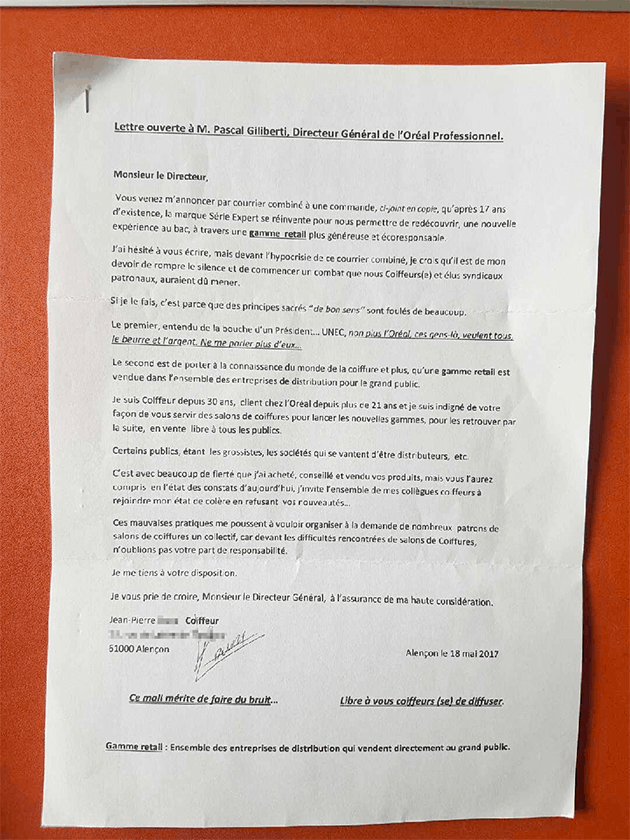 Dans cette lettre, le coiffeur se plaint des pratiques de la marque l’Oréal Professionnel qui met des produits professionnels à disposition des particuliers. Ici, le coiffeur attaque la gamme de retail, Serie Expert.