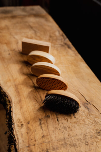 Le manche des brosses est en bois d’olivier. Quant aux coussinets, ils sont en latex naturel, une matière  résistante et imperméable. Deux épaisseurs de caoutchouc différentes pour assurer une souplesse optimale.