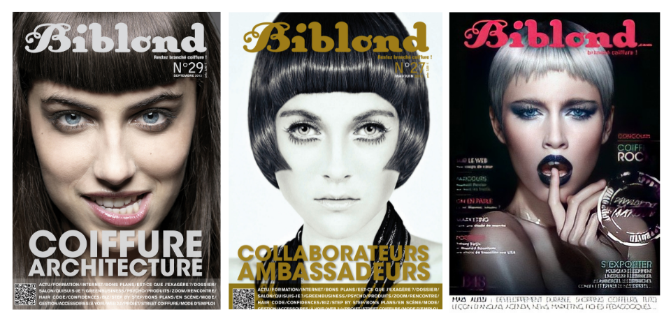 Basique et intemporelle à la fois, elle nous séduit depuis de nombreuses années. On la retrouve en couverture dès les premières éditions de Biblond, comme sur le magazine n°4 qui met en valeur un modèle coiffé par Stéphane Testu. On retrouvera ensuite régulièrement la frange droite en couverture : de toutes les couleurs, comme en 2012 avec l’édition n°26, et parfois vraiment très droite comme en février 2018 grâce à la création de Cyril Bazin.