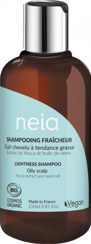 Pureté et légèreté ? Promesse tenue pour le Shampooing Fraîcheur de Neia, créateur de soins capillaires bio. Huiles de cèdre, d’eucalyptus et de menthe poivrée se marient pour un shampooing tout en douceur, qui purifie et rafraîchit le cuir chevelu. L’extrait de yucca et l’huile de neem régulent l’excès de sébum et