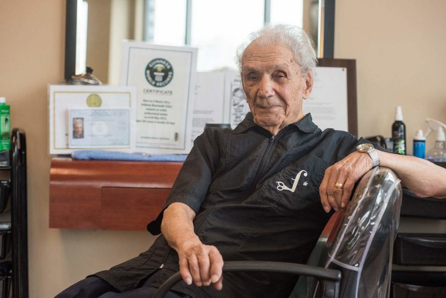 Le temps ne tue pas la passion. Anthony Mancinelli, à 107 ans, reste toujours derrière le fauteuil. Ce coiffeur d’origine italienne, installé à New York, compte derrière lui des décennies de coiffure. Et en a vu passé des générations de clients depuis son début d’activité, en 1922. A l’époque, il avait 11 ans.