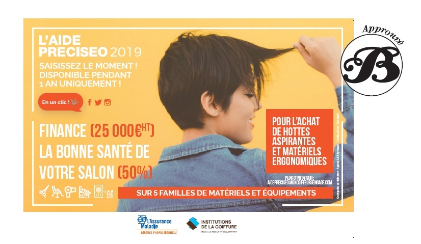 Pour vous permettre de veiller à la bonne santé de vos salariés, et aider financièrement les salons employant de 1 à 49 salariés, l’Assurance maladie Risques professionnels, en collaboration avec les Institutions de la Coiffure, membres d’AG2R La Mondiale Matmut, reconduit l’opération Preciseo. Forts du succès rencontré ces quatre dernières années, les partenaires proposent une aide d’un montant de 50 % de l’investissement hors taxes, à hauteur maximale de 25 000 euros.