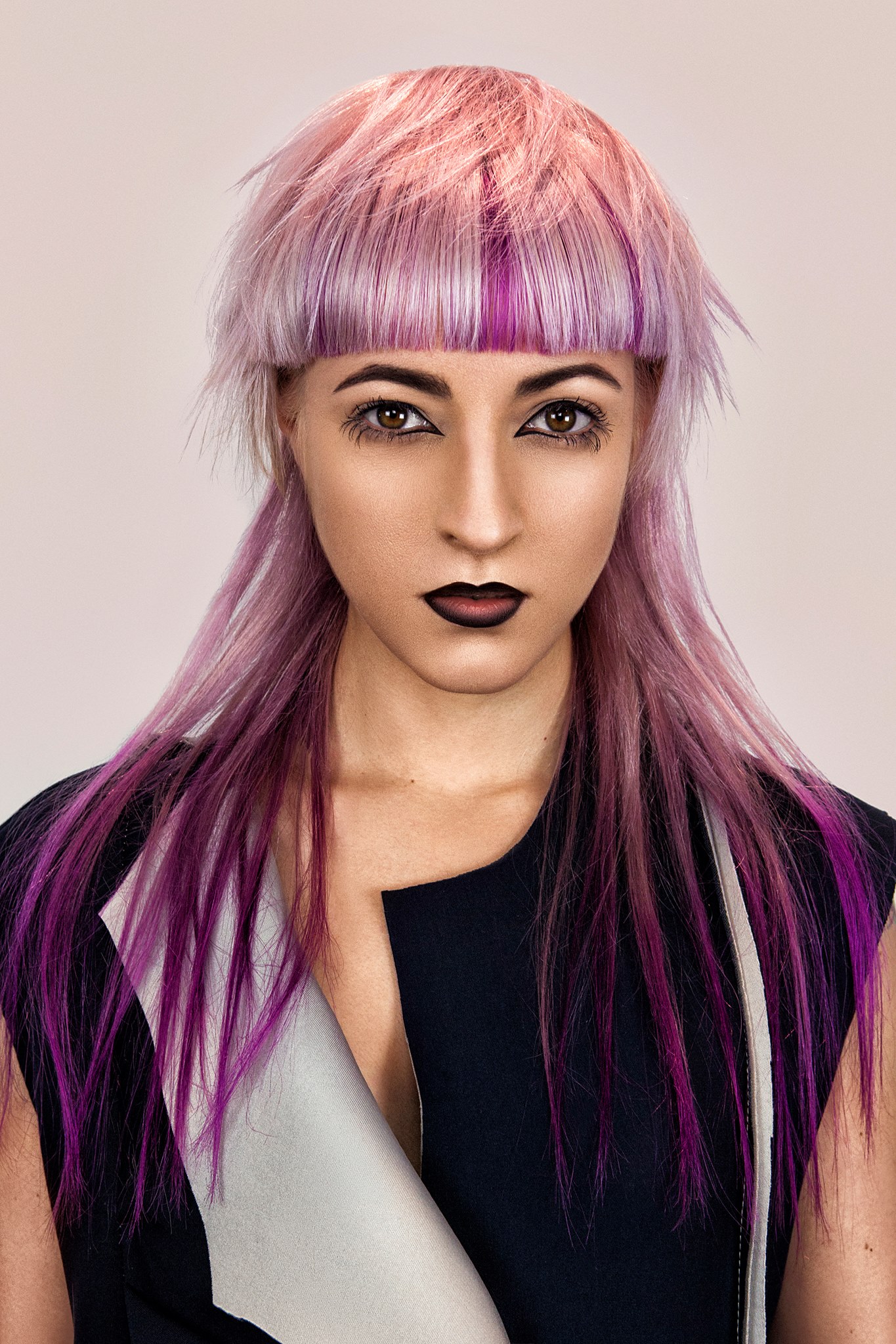« Nous avons travaillé sur une base de carré court texturisé sur l’ensemble pour obtenir une légèreté, avec des mèches longues sur l’arrière en gardant de la matière puis nous avons travaillé une frange épaisse et droite en rentrant dans l’implantation. »
