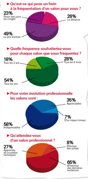 Pour conclure, les salons suscitent toujours l’intérêt de la profession à 91 % auprès des personnes sondées. 37 % se disent même de plus en plus attirés par ce genre de manifestation. 93 % les jugent utiles pour progresser. Parmi eux, 58 % pensent qu’ils sont indispensables à une évolution professionnelle.