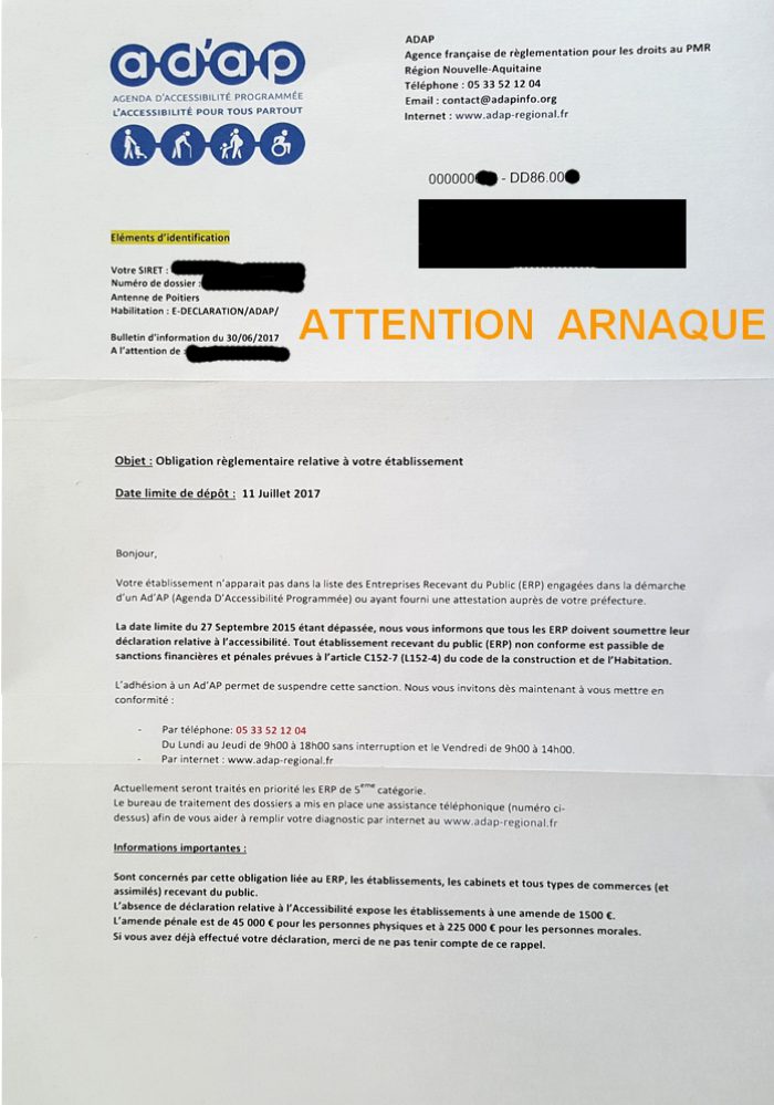 Pour rappel, les services de l’État n’effectuent presque aucun démarchage téléphonique auprès des propriétaires d’établissements recevant du public. Les chefs d’entreprise qui se posent des questions au sujet de la mise en accessibilité de leurs établissements peuvent joindre la sous-commission départementale à l’accessibilité ou se rapprocher des chambres de commerce et des métiers.