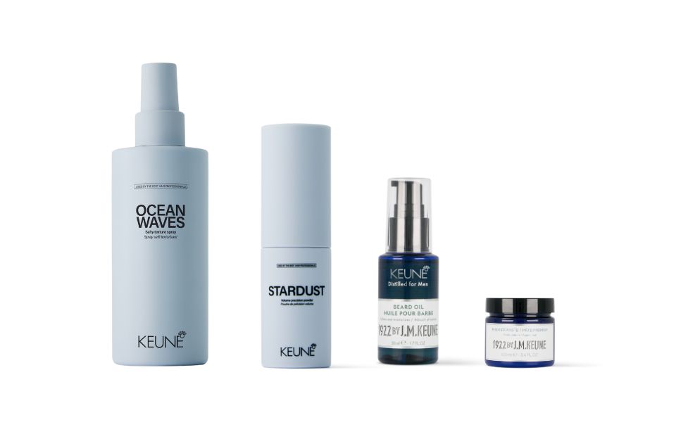 Lot de 3 produits d’une valeur de 80 € comprenant la Beard oil 1922 By J.M. Keune et Ocean Waves et poudre Stardust. Adoucit, hydrate et fait briller naturellement grâce à un riche mélange d’huiles, dont l’amande douce. Apporte texture et volume avec un spray salé effet retour de plage et une poudre légère à finition mate.