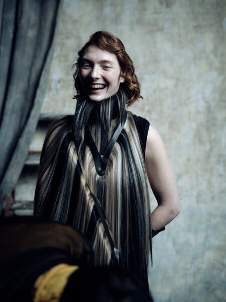 Bien ancré dans l’époque, cet artiste est profondément attaché aux valeurs qui animent les nouvelles générations. Parmi elles, une vision non binaire, l’économie circulaire, mais aussi l’upcycling qui consiste à récupérer des matériaux ou des produits dont on ne sert plus pour leur offrir une nouvelle vie. « Je suis allé à la Réserve des arts, une association à but non lucratif. Les freelancers ont accès à leur immense hangar, où dénicher des anciens décors de ciné, des chutes de tissus, du cuir, des boutons ou des fermetures éclair, issus des stocks des maisons de couture. »