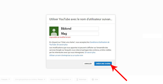 - Ensuite une fenêtre s’ouvre dans laquelle vous pourrez nommer votre chaîne YouTube. Choisissez un nom qui reste dans les esprits et qui correspond avec le contenu que vous allez proposer. Puis cliquez sur « Créer une chaîne »