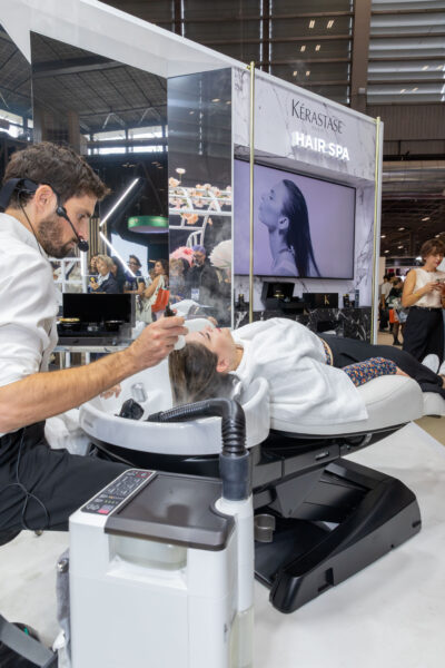Au coeur du MCB by BS, le Hair Spa de Kérastase, ses produits, ses rituels de soin, accompagnés d’un équipement de pointe signé par l’entreprise japonaise Takara Belmont attiraient tous les regards. Puis en arpentant les allées, le visiteur n’a pu échapper au phénomène. Hair Spa, Head Spa, Spa du Cheveu, Spa capillaire… Peu importe comment vous le nommez. Pratique millénaire venue d’Asie, à travers les traditions de la médecine chinoise ou ayurvédique, le Hair Spa consiste en un soin capillaire profond, pensé pour réparer, hydrater et revitaliser les cheveux, en prenant soin du cuir chevelu. Présent dans 95 % des salons au Japon, le Head Spa allie soin et massage inspiré du shiatsu. Tout est mis en oeuvre pour le bien-être de la cliente : tisane d’accueil, parfum d’ambiance, sensorialité des produits, massages profonds, produits aux résultats visibles… Rien ne doit heurter ce moment privilégié.