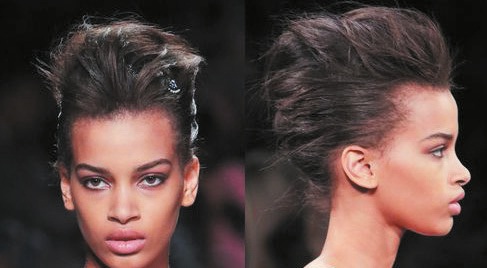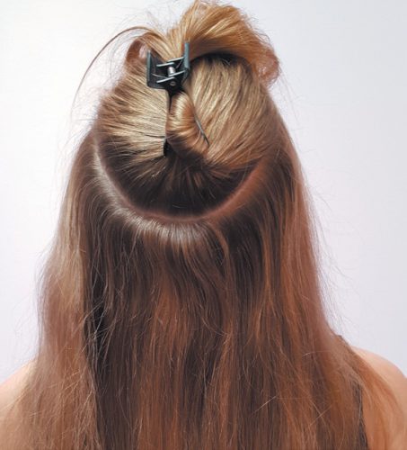 Faire une séparation en fer à cheval, point de sourcil à point de sourcil jusqu’au dessous du vertex.