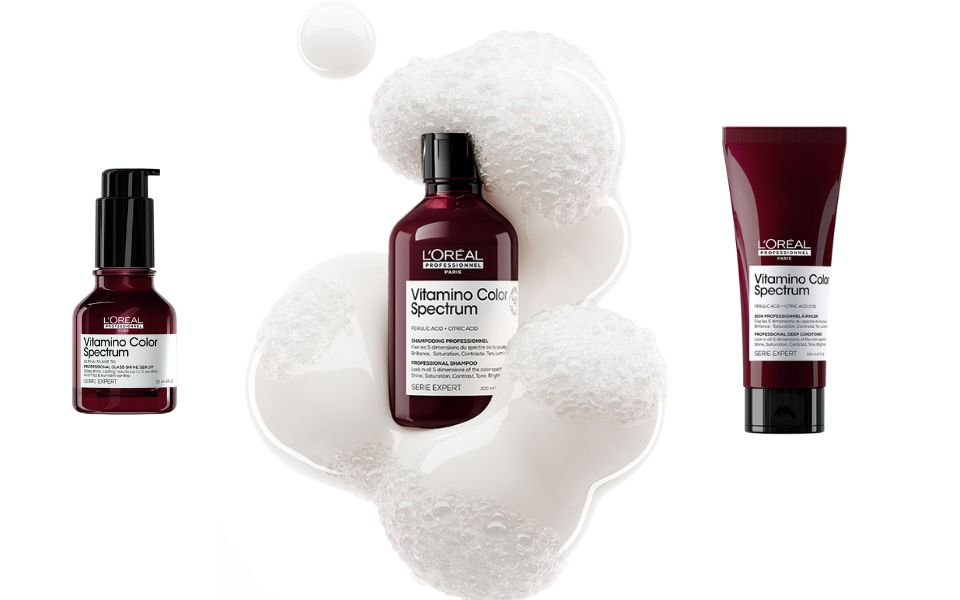 Vitamino Color Spectrum de L’Oréal Professionnel « préserve une couleur intense jusqu’à cent jours, comme au premier jour ». Promesse tenue pour une gamme composée de shampooings (professionnel nourrissant ou neutralisant), soin concentré, masque, sérum concentré brillance miroir. Vitamino Color Spectrum offre des couleurs riches et vibrantes, une perception optimale entre les différentes nuances, neutralise les reflets indésirables et préserve les niveaux de luminosité et de profondeur. Pour une brillance miroir et des cheveux sublimés, protégés et éclatants !