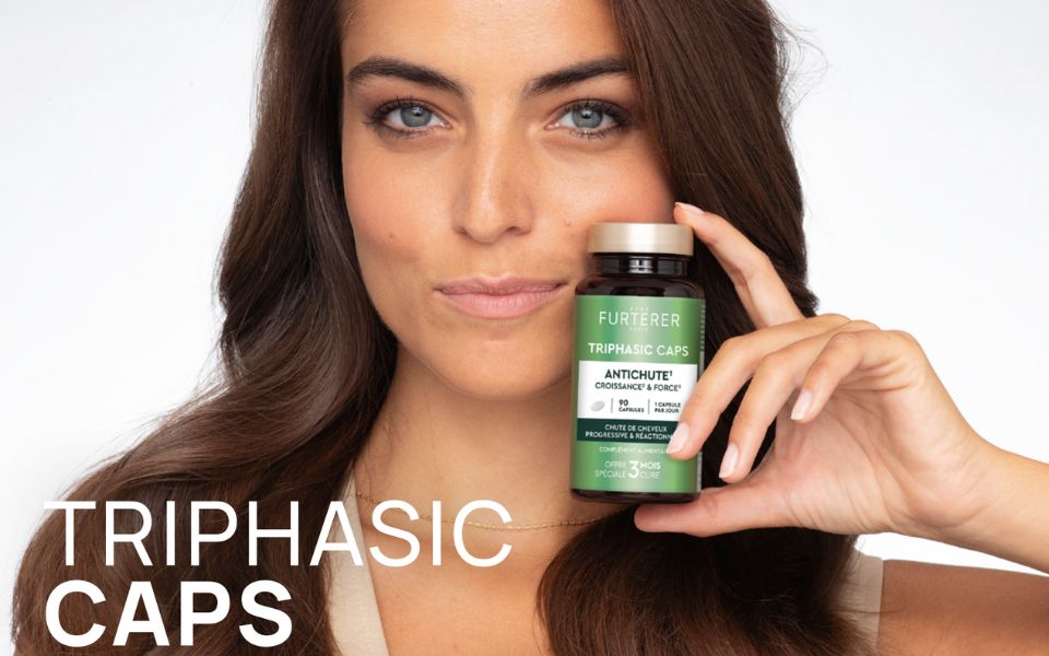 Les compléments alimentaires capillaires Triphasic Caps de René Furterer, favorisent la croissance et limitent la chute. Ils apportent des micronutriments, stimulent la microcirculation et augmentent l’apport en oxygène au niveau des cellules du cuir chevelu. Serenoa repens et huile de pépins de courge, extraits de prêle des champs et de bambou, D-Biotine et sulfate de zinc pour des cheveux en pleine santé.