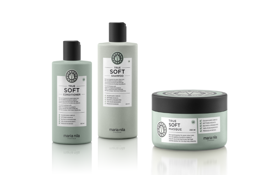 La gamme True Soft, de Maria Nila, se compose d’un shampooing, d’un après-shampooing, d’un masque et d’une huile sans rinçage.