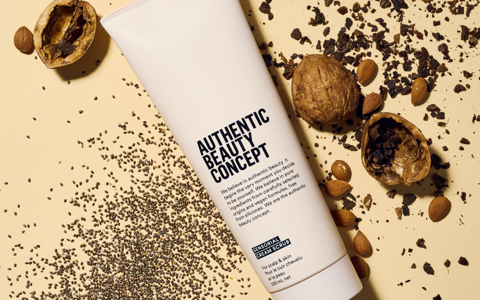 La Crème Gommage Douceur d’Authentic Beauty Concept exfolie à la fois le cuir chevelu, le visage et le corps.