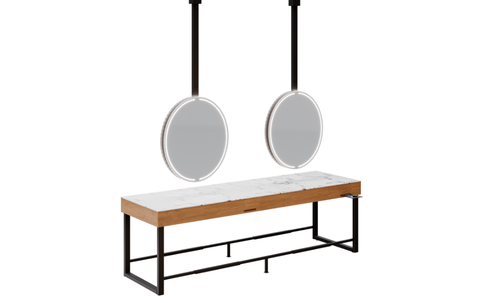 Donner de l’élégance au mobilier ? Pari réussi pour ce nouvel espace de coiffage modulable grâce aux miroirs centraux et suspendus. Une belle manière de structurer les espaces, de manière chic.
