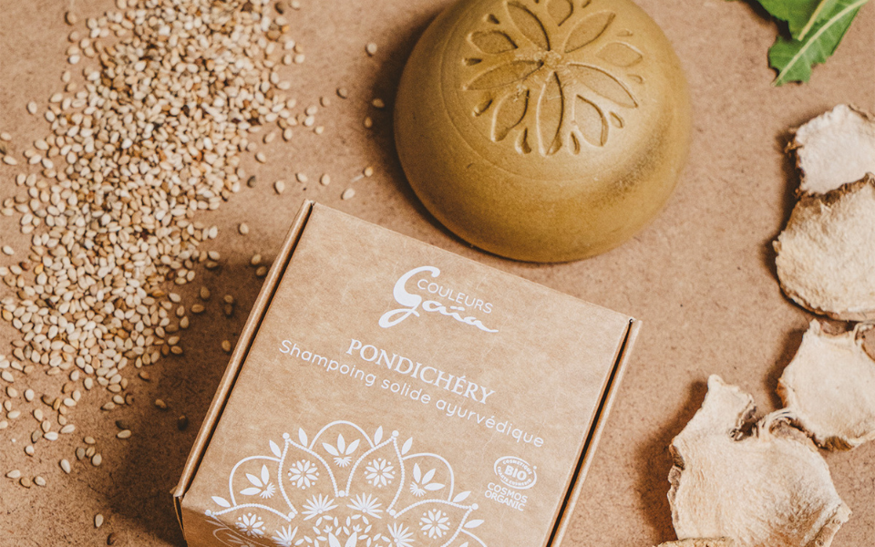 Couleurs Gaïa présente Pondichéry, un shampooing solide formulé sans sulfate et sans SCI. parfaitement adapté à l’entretien des colorations végétales.