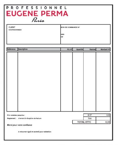 Document adressé à un fournisseur par le responsable du salon de coiffure pour matérialiser une commande. Il constitue un engagement juridique et financier. Il contient la date, le nom et l’adresse du fournisseur, le numéro de la commande, les articles désirés (quantité, prix HT), le prix total TTC, le mode de livraison, le mode de paiement et la signature de l’acheteur.
