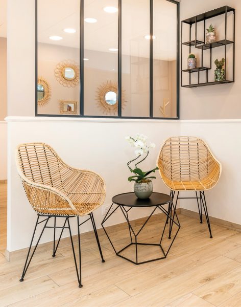 Déjà bien installé dans le cercle des tendances, le cannage (rotin, osier, corde) apporte beaucoup de douceur et d’artisanat dans un salon de coiffure. Cette technique de tissage en fibres naturelles apparaît sur le dossier d’un fauteuil, les portes d’une coiffeuse, les grandes suspensions aux dimensions XXL.