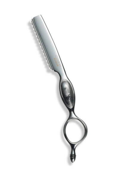 L’astuce du pro : « Pour créer une sorte de casquette en avant, j’affine les mèches du devant au Feather. »