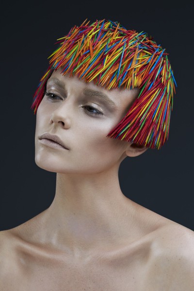 Le cure-dent, de par sa forme régulière, rigide et fuselé sur la pointe, permet un jeu de ressemblance avec le cheveu. Sa taille réduite et fine joue l’ambiguïté et permet de créer ces effets de légèreté et texture. Cette coiffure a nécessité 2000 cures dents pour apporter ce réalisme de matière. Les cure-dents ont été peints un à un à la gouache diluée pour préserver les nervures du bois en transparence. 6 couleurs ont été utilisées pour créer des effets de profondeur et de dynamique.