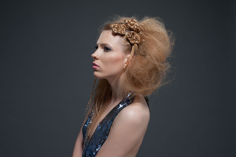 Sur la demi-portion arrière de la tête, les longueurs sont gaufrées puis crêpées pour un effet maxi volume. Elles sont ensuite fixées avec de la laque et coiffées en arrière de manière à former une masse uniforme et aérienne.
