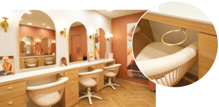 Chaque élément de la décoration a été pensé pour contribuer au bien-être de la cliente. La luminosité du salon est apportée par des teintes douces de rose poudré, de beige, de nude et d’orangé. Le ruban de laiton autour des miroirs disposés crée une touche délicate. Quant aux appliques en opale, elles réchauffent l’espace de leur éclat.