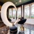 Comment métamorphoser sans dénaturer ce mini-manoir ? Avec du mobilier contemporain et parfois sur mesure de la marque Gamma & Bross, qui crée une atmosphère particulière, comme cette grande coiffeuse centrale ronde Lady Jane Collare du designer Marcel Wanders. « Pour les couleurs de l’espace, le sol et l’agencement, Clara, l’architecte de Gamma & Bross a su me convaincre. Et ce n’était pas gagné ! J’avais en tête de réaliser un salon noir et blanc. Et aujourd’hui, je contemple un magnifique plafond vert (Beverly de Farrow & Ball), dans la partie coiffure féminine! » Cette option aura pour effet d’agrandir l’espace et de sublimer le volume de la pièce en question.
