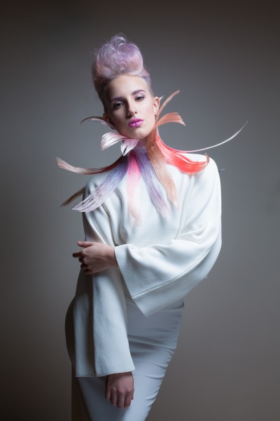 Une teinte pastel rose pâle a été appliquée sur les demi-longueurs et un violet pâle sur les longueurs. Côté coiffure, nous sommes en présence de boucles pour créer des coiffures souples et apporter du volume à la chevelure. Une création parfaitement ancrée dans l’air du temps quand on sait que le rose est le hit coloration de la saison !