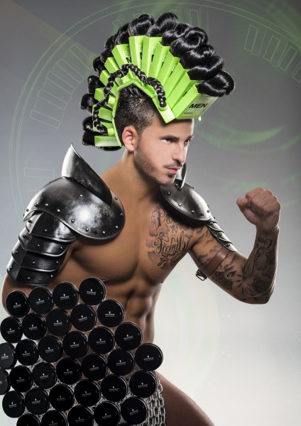 Pour cette coiffure masculine Loris Hug s’est inspiré des casques de gladiateurs. Il a créé avec des accessoires cette incroyable coiffure qui symbolise la force des guerriers de l’époque.