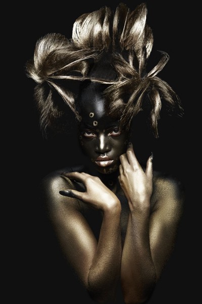 Marier l’or et l’ébène, impossible ? Défi relevé pour Emmanuel Esteban. Ces deux matériaux, au premier abord diamétralement opposés, s’associent à merveille dans sa nouvelle collection : « Ebony & Gold ». Inspiré par la beauté des bijoux, notre coiffeur s’est donné pour défi de recréer leur forme mais surtout leur aspect. Tout au long du processus de création, il a tenté de donner de la profondeur à ses coiffures et d’obtenir un effet 3D. « J’ai mélangé plusieurs techniques traditionnelles africaines telles que le twist de mèches, mais j’ai aussi usé de techniques de “sculpture” du cheveu et de postiche. » Voulant pousser les contrastes jusqu’au bout, le résultat, très singulier en l’occurrence, est loin d’être déplaisant pour les yeux.