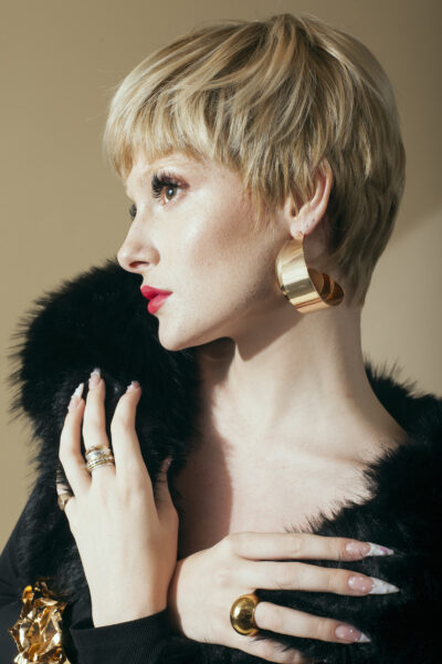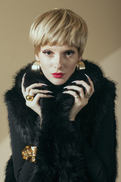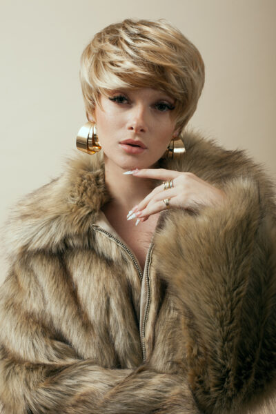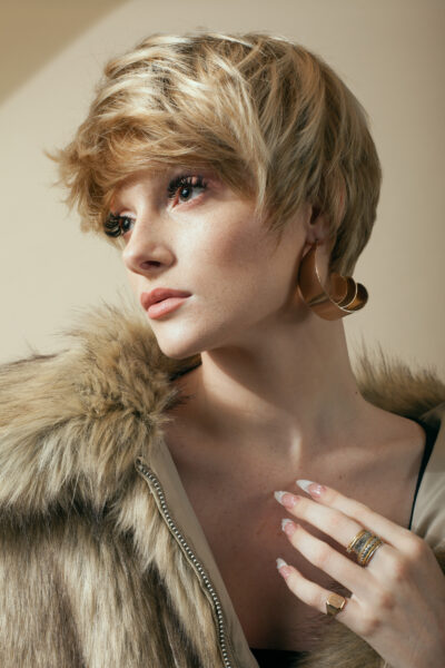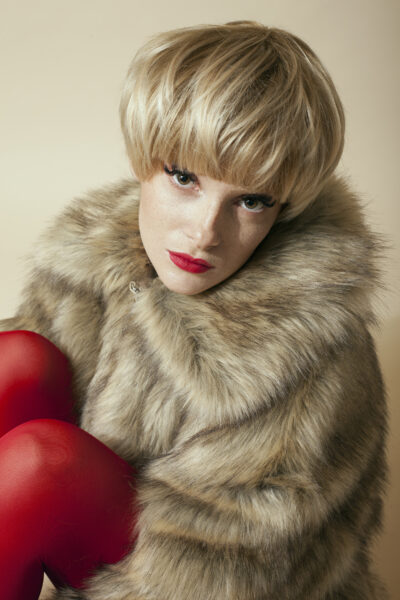 Coiffée à la garçonne, ou en version boule anglo-saxonne sixties’s. Mais aussi en look androgyne, avec ses mèches très courtes autour du visage.