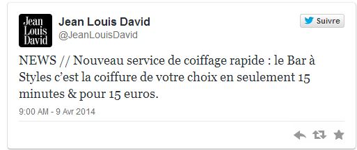 Le compte Twitter de la franchise l’a annoncé, elle ouvre son Bar à Style. L’idée est la même que pour Didact Hair Building mais en moins onéreux. Désormais, dans la plupart des salons Jean Louis David on trouvera un choix de 10 coiffages qui seront réalisés en 15 minutes pour un montant de 15 euros.