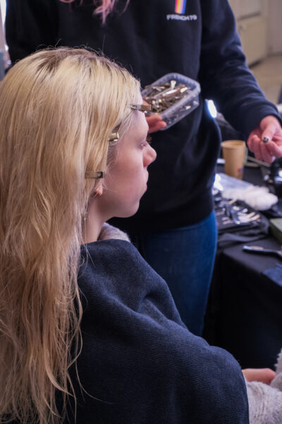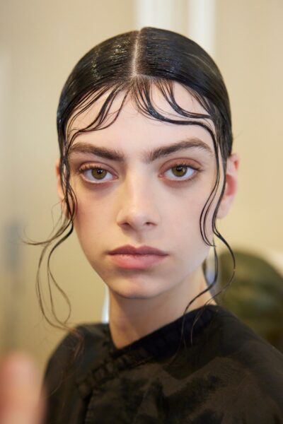 En backstage de son défilé, l’équipe coiffure, menée par Damien Boissinot, hairstylist de René Furterer, a imaginé un style original, « arabesques de baby hairs », en accord avec la ligne directrice de la collection, un équilibre entre des mouvements artistiques contrastés, de la Renaissance au romantisme. La coiffure transpose la tendance styling des baby-hairs à des références historiques, en dessinant des volutes dans un effet matière très brillant. « Je me suis inspiré d’un côté très pur, très fragile comme des angelots tout droit sortis de tableaux de la Haute Renaissance avec un côté plus rock, moins sage pour offrir une dualité réconciliée et lumineuse », confie Damien Boissinot.