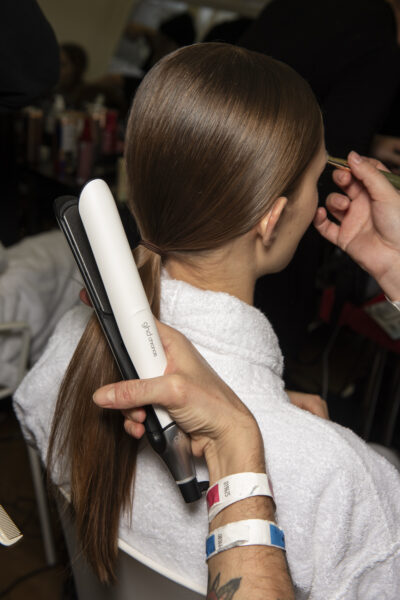 Partenaires du défilé de Victoria Beckham, Wella Professionals et ghd ont surfé sur la tendance des cheveux sains et doux. Le chef de cabine Anthony Turner a su répondre, avec brio, à la demande de l’ex-Spice Girl, à la tête de sa maison de mode depuis 2008 : des cheveux soyeux attachés en queue-de-cheval basse avec une raie au milieu nette pour un look élégant. « J’adore Victoria et nous avons longuement échangé sur la texture des cheveux que nous souhaitions. […] Nous avons essayé de nombreuses variations, mais Victoria a aimé le fini lisse et chic. Pour réaliser cette coiffure, j’ai utilisé la gamme Ultimate Repair de Wella Professionals, qui m’a permis d’assurer jusqu’à 99% de casse en moins sur les cheveux des mannequins. Le lisseur ghd Chronos est définitivement mon outil favori pour lisser les cheveux rapidement et créer un look doux et brillant – cette innovation technologique est parfait en backstage puisqu’il permet de coiffer trois plus rapidement », précise Anthony Turner.