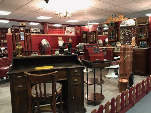 Le clou du musée : la reconstitution d’un salon de coiffure du début du XXe siècle avec des fauteuils des années 1920 et un meuble de barbier de 1915.