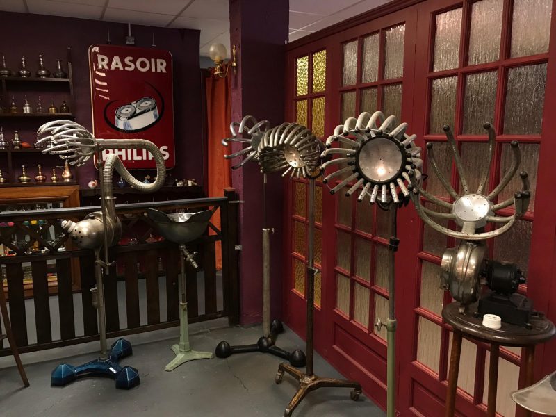 Dans cette caverne d’Ali Baba dédiée à la coiffure, aux 4000 trésors, l’espace présente pas moins d’une vingtaine de thèmes : tondeuses et ciseaux, fers à friser et fers à gaufrer, sèche-cheveux électriques, blaireaux, rasoirs électriques et rasoirs papillons, appareils à permanentes (dont un modèle de 1930), enseigne de coiffure, flacons, bouteilles de lotion…