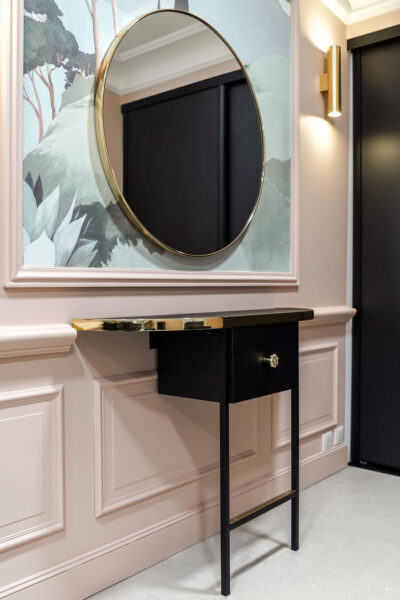Tout d’abord la déco : les poutres d’origine, la frise qui rappelle la signature de Versace, le carrelage avec son imitation parquet en position chevron comme les appartements haussmanniens de Paris, le carrelage noir et blanc, façon damier. « Il me fait penser au conte Alice au pays des Merveilles, un endroit magique et beau. » Il y a aussi toutes les teintes aux murs, reposantes « comme le lin et le gris plomb, plus enveloppant, plus chaud que le noir ».