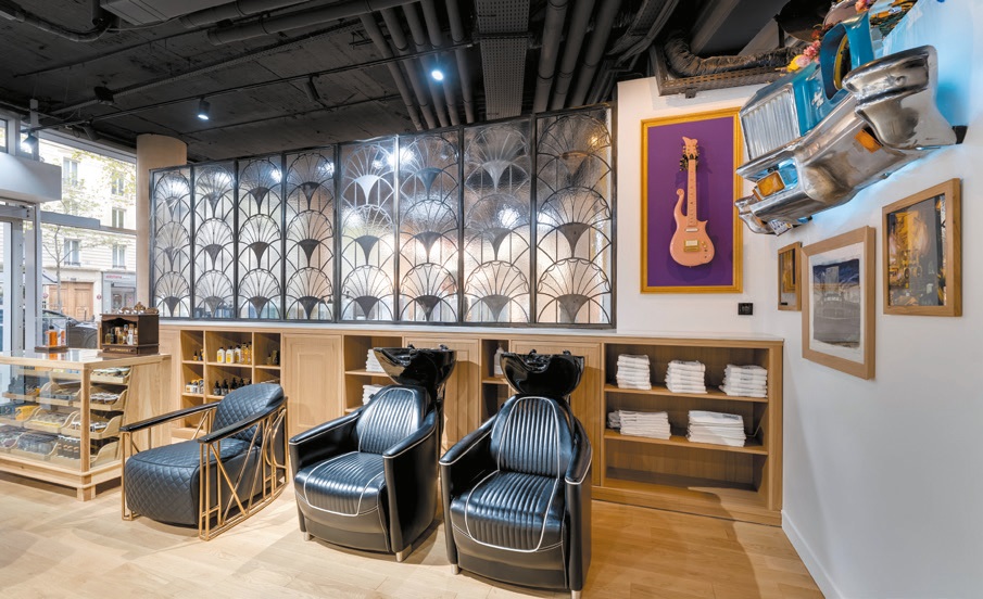 L’espace dédié aux femmes comporte onze places de coiffage et un piano blanc, astucieusement placé au niveau des bacs. « Pour éviter de voir sous les jupes de ces dames. » Côté déco, les deux couples ont voulu insuffler un esprit Art déco, une tendance résolument glamour et surprenante avec ces grands miroirs ronds dotés de collerettes. Les fauteuils, le comptoir de réception et les coiffeuses sont aussi signés Jane by Marcel Wanders pour Gamma & Bross. D’autres aménagements favorisent l’exception du lieu et l’intimité, comme l’espace technique et sa belle verrière Art déco. Sans oublier les belles arabesques en mosaïque dessinées au sol.