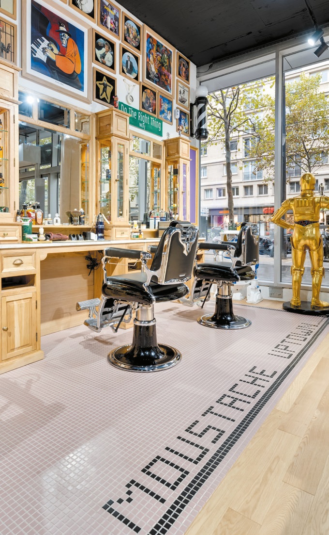 Chez les hommes, place à la contemplation : on passe des magnifiques fauteuils de barbier Takara Belmont à la convivialité et la curiosité des murs tapissés de cadres remplis de pochettes de disque de Prince ou de Michaël Jackson, d’affiches de films, d’instruments de musique – guitare, saxophone –, d’éléments d’anciennes voitures ou encore de photos de stars d’Hollywood. « Samir est un grand passionné de Funky Music. Il collectionne pas mal de trucs. Dans la vitrine, il y a aussi quelques références à Star Wars comme cette figurine grandeur nature de C-3PO ou de R2D2 », souligne Sonia. Le tableau serait incomplet si l’on n’évoquait pas la présence du piano à queue en plein milieu du salon.