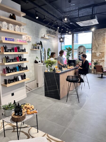 Quatre mois ont été nécessaires pour repenser l’espace de 120 m2 en duplex et 150 m2 avec le sous-sol. « Je voulais aussi que mes client(e)s puissent se détendre dans un lieu velouté avec des éclairages indirects. Bref, un lieu chargé de bonnes ondes… » Pari réussi ! Une décoration cosy grâce aux matériaux nobles et design, aux touches raffinées avec de grands voilages en fibres naturelles : les soins au bac sont de vrais instants de sérénité et de détente.