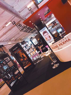 Il est important d’avoir plusieurs espaces dans lesquels les visiteurs puissent circuler. Il faut une grande zone conviviale et en même temps une certaine proximité avec les clients. Pour attirer les visiteurs, Eugène Perma avait prévu des vidéos artistiques à la place des démonstrations techniques. Et pour rendre la visite plus ludique, un appareil photo et une machine à pince comme dans les fêtes foraines avaient été installés. Succès garanti !