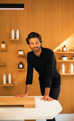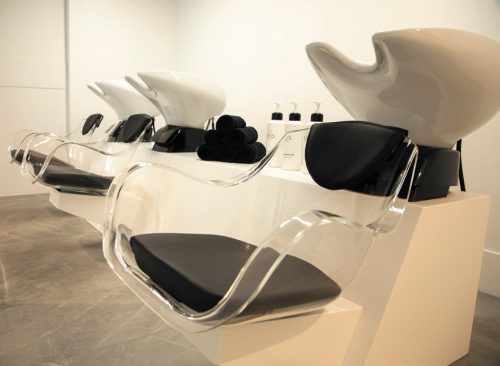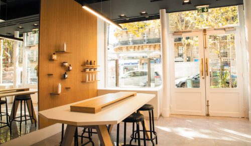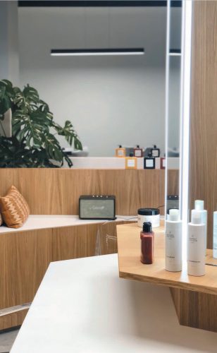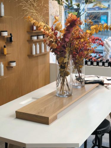 Raphaël – c’est ainsi qu’il se présente – se définit comme un coloriste touche-à tout, qui a fait ses premières armes dans le célèbre salon parisien Coloré par Rodolphe. En 2011, il rencontre Valérie Guérin, experte en coupe et, en 2013, le tandem ouvre un salon en appartement, rue Boissière dans le XVIe arrondissement de Paris. Pour pimenter leur quotidien, ils décident de créer une adresse-concept, sans rendez-vous, entièrement dédiée à la couleur aux ingrédients naturels. Après cinq mois de travaux, Moment Couleur ouvre le 11 septembre dernier. Mais cette fois, Raphaël est seul aux commandes. Un univers qu’il a peaufiné pendant deux ans avec l’aide d’une agence de publicité (pour le nom, la charte graphique et la communication) et d’un architecte pour la mise en beauté des 115 m2 de surface. « Mais pour le travail, nous avons réellement 65 m2 de superficie », précise le maître des lieux. Comme dans une jungle apaisante, une dizaine de plantes baignent cet univers bienveillant de son énergie revitalisante, si chère à ce coloriste. Murs blanchis, plafonds sertis de lumières, marbre gris au sol, imaginé en deux matières : une finition brillante aux endroits où l’on réalise les colorations et une finition mate pour le reste des zones du salon. Puis il y a aussi cette présence chaleureuse apportée par le bois, du chêne massif. Il recouvre de grands pans de murs où se cachent d’astucieux placards. « Tous nos outils, produits et tubes sont stockés à l’intérieur. Pas de pollution visuelle ! » Ce bois donne une âme au lieu. Tout comme cet hexagone, cet espace coloration autour d’une colonne avec de vastes miroirs, qui trône au milieu du salon. « Chaque cliente peut profiter de prises individuelles pour recharger son téléphone », dit celui qui n’aime pas du tout les ambiances de salon traditionnel. D’ailleurs, côté coiffure, comme à New York, les clientes peuvent utiliser un sèche-cheveux mis à leur disposition pour réaliser un coiffage naturel.