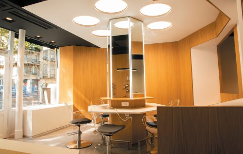 Le salon est divisé en deux parties : le rez-de-chaussée avec l’espace couleur, un îlot central, l’espace attente et sa belle table en bois dédiée aux clientes qui patientent lors de la pose couleur et l’espace bacs (Cindarella) ; puis, le sous-sol, c’est l’antre des collaborateurs.