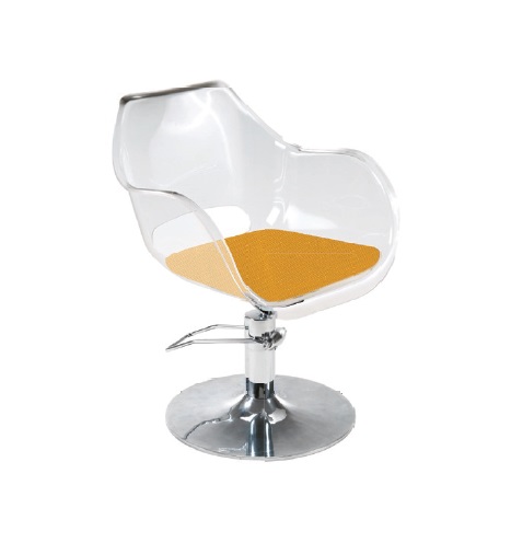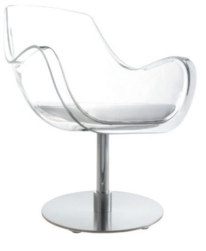 1• Fauteuil Manon est doté d’une pompe hydraulique, d’un coussin et de 6 coloris de Plexiglas : transparent – choisi par Moment Couleur –, gris fumé, noir compact, blanc compact, vieux rose et marron glacé. Cindarella.