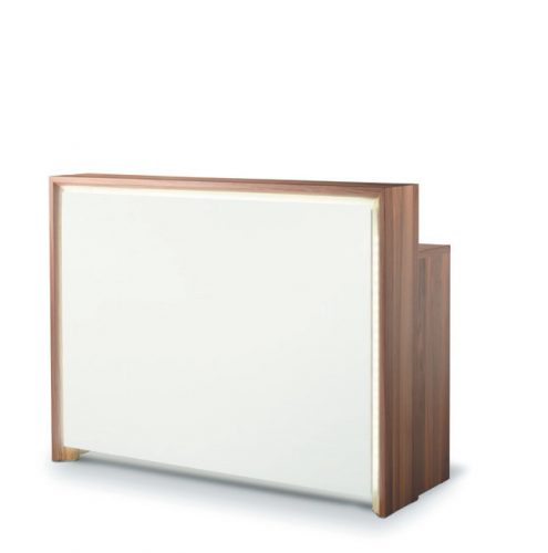 3 • Comptoir d’accueil Pandora, placage stratifié, cadre lumineux Led, prises électriques intégrées, espaces de rangement et tiroirs. L 145 x P 56 x H 110 cm. Takara Belmont.