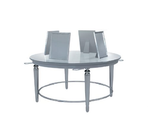 5 • Table Colline de la collection Bohème, 4 places, structure ronde en MDF laqué avec plateau en verre extraclair trempé. Dimensions : diamètre 135 x H 80 cm. Maletti.