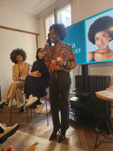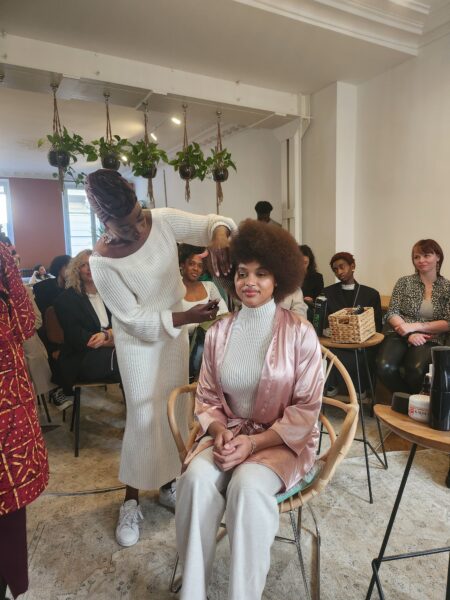 Des échanges autour des enjeux sur les cheveux texturés en salon et un workshop orchestré par la pétillante Aïssata Dramé (@Boost_tes_cheveux), formatrice spécialisée dans les cheveux texturés et qui a réalisé, pour l’occasion, un très beau coiffage afro avec simplement de la laque et un peigne.