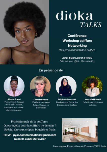 « Après une école de commerce, j’ai travaillé dans la mode et le luxe, en marketing produits. Je créais des collections de maroquinerie avec des stylistes pour les défilés. J’ai démissionné en 2019. J’avais besoin de trouver un travail qui avait plus d’impact sur la société. Cela a coïncidé avec le moment où je suis revenue, capillairement parlant, au naturel, après avoir, plus jeune, défrisé mes cheveux. Cela a toujours été compliqué, pour moi, de trouver un salon, encore plus quand je suis revenue au naturel. Finalement, j’ai trouvé le bon coiffeur, celui qui m’a réconcilié avec mes cheveux et avec les salons de coiffure ! J’ai eu envie de partager les bonnes adresses, celles de coiffeurs passionnés qui se forment au-delà de nos frontières pour prendre soin des cheveux texturés. J’avais envie que d’autres femmes, qui comme moi avaient peur d’aller chez le coiffeur, puissent vivre ce que j’avais vécu. C’est comme ça que j’ai créé le label de qualité, Dioka, en 2020.! »