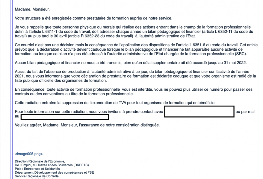 Pour toute personne faisant de la formation en France pour son propre chef où pour un organisme tier se doit d’avoir une déclaration d’activité de formation et de se contraindre annuellement à un bilan pédagogique et financier (article L 6352-11 du code du travail) au plus tard le 30 avril (article R 6352-23 du code du travail) à l’autorité administrative de l’Etat.