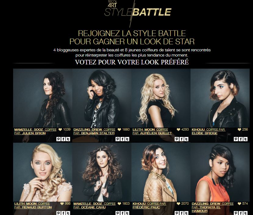 Les bloggeuses Kihouu, MamzelleSooz, DazzlingDREW et Lilith Moon ont été invitées à rencontrer huit jeunes coiffeurs de talents lors d’une soirée à l’Acamédie L’Oréal Professionnelle de Paris, le 12 mars derniers. Huit groupes ont ainsi été formés, défendant chacun un look cheveux parmi les plus en vogue cette saison. Et dès le début du mois d’avril, les internautes ont été invités à voter pour élire leur look préféré.